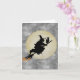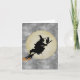 Silhouette of witch on a broomstick with fire coming out of the broom and a black cat perched on the handle against a round full moon.