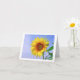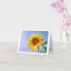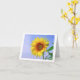 This charming floral postcard features an image of a vibrant yellow sunflower highlighted against a creamy sky blue background.