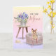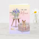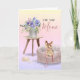 Este lindo cartão de aniversário apresenta uma adorável ilustração em aquarela de um Yorkshire Terrier sentado em sua caminha com uma trela na boca. A cena na frente do cartão inclui uma tigela de comida, um osso e uma mesa de madeira com uma lata de farinha cheia de belas flores sobre um fundo alegre de cores pastel em arco-íris. O interior do cartão inclui um bolo e diz "Feliz Aniversário! (minha tigela de comida está vazia)". Personalize-o com seu próprio cumprimento, o nome do seu precioso animal de estimação na tigela de comida (na frente e no interior do cartão) e a assinatura no interior acima da impressão da pata.