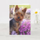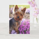 Os de Yorkie são cachorros muito especiais com uma grande personalidade. Esta fotografia é de uma garotinha muito viscosa sentada numa cama de flores roxas.