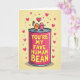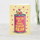This greeting card shows a bright pink tin can in the center with two cute bean-shaped characters sitting on its rim. One bean is orange and smiling, and it holds up a small bouquet of pink and yellow flowers toward a rosy pink bean that smiles back. Both characters have simple dot eyes and wide, happy grins that make the moment feel sweet and friendly. On the front of the can, the message “YOU’RE MY FAVE HUMAN BEAN” appears in yellow block letters that are easy to read. A large magenta heart floats above them, and the background is a soft yellow with scattered small magenta hearts and little yellow stars. The overall setting feels like a simple, cheerful Valentine scene with a fun pun at the center ❤️