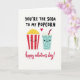 This greeting card features a white background with two smiling snack characters facing each other. On the left is a red-and-white striped popcorn bucket filled with golden popcorn, complete with rosy cheeks and a friendly expression. On the right is a teal soda cup decorated with white polka dots, topped with light foam and a red straw, smiling back just as sweetly. A small red heart floats between them, showing their connection. At the top, the message reads “YOU’RE THE SODA TO MY POPCORN” in simple black block lettering. Near the bottom, “happy valentine’s day!” appears in red cursive script, like a handwritten note. The open white space keeps the focus on the characters and their bond, making this a warm, lighthearted card for a partner or close friend on Valentine’s Day ❤️💌🍫.