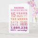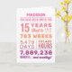 Personalized “You Have Been Loved For 15 Years” birthday card featuring milestone numbers—years, months, weeks, days, hours, and minutes. Add the recipient’s name for a custom touch and edit the inside message to make it your own. A unique, heartfelt birthday card perfect for a 15th birthday milestone celebration.