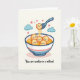 This Valentine’s Day card features a bowl of wonton soup filled with charming character details. Inside the bowl are six smiling wontons with rosy cheeks and soft wavy edges. Five float happily in a warm golden broth with thin noodles, while one wonton is lifted by a light blue spoon, drawing attention to its joyful expression. Pink hearts rise above the bowl, joined by two small blue clouds that add a gentle, dreamy accent. The background is a warm off-white that highlights the soft pastel colors. Below the illustration, bold lettering reads, “You are wonton in a million!” making this card a sweet and thoughtful way to share love 💌✨.