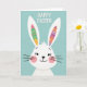This card shows a friendly, human-like bunny centered on a muted teal background, looking straight out with an inviting, affectionate expression 🐰. Its tall white ears rise upward, and inside each ear sit egg-shaped patterns in pastel green, yellow, orange, and purple with zigzags and stripes that feel like little gifts tucked close. The bunny’s large black eyes with small lashes and its gentle smile suggest the kind of warm attention you’d give a close friend. Soft pink cheeks and thin black whiskers add a tender, bashful touch, as if it’s quietly pleased to be near someone. Across the top, a seasonal greeting appears in bold white sans-serif letters, spaced clearly above the bunny’s head. The teal backdrop has a faint grainy texture that keeps the flat shapes from feeling stark, and the overall palette stays soft and springlike 🌷. The patterned eggs sit neatly within the inner ear shapes, framed by crisp white edges against the teal field.