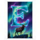 Traga a radiante beleza do norte para as suas paredes com este pôster da letra E da Aurora. Uma luminosa letra E ergue-se acima de uma floresta coberta de neve, iluminada por faixas fluídas de Luzes do Norte em tons ricos de esmeralda, turquesa e violeta. A aurora cintila pelo céu noturno, lançando um brilho suave sobre a paisagem invernal tranquila e iluminando suavemente o alce pacífico que está de pé majestosamente na base do monograma.