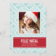 Caractéristiques de conception de carte de vacances mondial unique d'inspiration une glace clair / bleu aqua et blanc ikat losange avec un regard tissé rustique moderne et une bande de ruban rouge qui encadre la photo. Personnalisez cette carte élégante et unique avec votre portrait préférée et texte personnalisé.