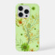 Uma carteira verde de pistão na moda com flores delicadas e folhas caídas - um acessório macio e moderno para proteger seu telefone com elegância.