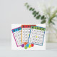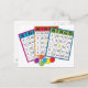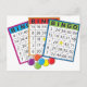 Três cartões de bingo coloridos.