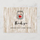 Cartões de agradecimento de pote de pedreiro com grãos de madeira de celeiro. Modelo de convite personalizado moderno com design rústico country chic. Arte linda para casamento de festa ao ar livre, celeiro ou jardim. Parte de um grande conjunto de coleção elegante com mais itens de papelaria sofisticados e acessórios bonitos. Textura de painel de madeira marrom com corações de amor desbotados e fofos e design de vidro de jarro de pedreiro. Forma de recorte de vieira personalizável. Modelo de texto de tipografia de roteiro elegante e bonito. Adicione seus próprios nomes de casal de noiva e noivo.