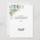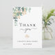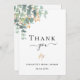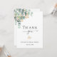 Um cartões de agradecimentos para um Chá de panela. Um fundo branco chico decorado com verde de eucalipto. Na frente, um grande script de cor preta, escrito à mão, e o texto: Obrigado, seu e uma data. Voltar: Personalize e adicione seu nome e nota de agradecimento.