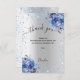 Fundo de aspecto fino prateado, decorado com brilho azul claro, faíscas e flores azuis. Escrita escrita com letras grandes com baloiços e o texto: Obrigado. Personalize e adicione sua nota de agradecimento e seu nome.