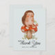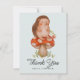Design de Cartões de agradecimentos alegre com um adorável ouriço sentado em um cogumelo branco, segurando um buquê de flores em uma charmosa ilustração de aquarela. O fundo é uma linda cor azul-bebê.