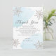 Este elegante cartões de agradecimentos de chá de fraldas de inverno apresenta um fundo azul claro em aquarela com falso falso floco de neve prateada. O verso apresenta um fundo de neve gelada. Personalize-o para as suas necessidades. Você pode encontrar produtos correspondentes na minha loja.