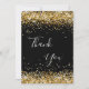 Um cartões de agradecimentos de aniversário feminino e elegante. Uma cor preta de fundo. Com um confete de ouro falso. Na frente, o texto escrito em letras grandes e o texto: Obrigado. Voltar: Personalize e adicione seu nome e nota de agradecimento. O nome é escrito com um moderno estilo escrito à mão com traços. Para manter as hastes, exclua apenas o nome da amostra, deixe os espaços ou emoji na frente e depois do nome.