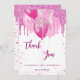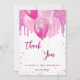 Uma cor branca de fundo. Com brilho sujo rosa, faíscas, balões rosa pastel e rosa quente. Na frente, o texto escrito em letras grandes e o texto: Obrigado. Voltar: Personalize e adicione seu nome e nota de agradecimento. O nome é escrito com um moderno estilo escrito à mão.