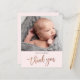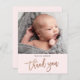 Esta foto moderna, graças a você, mostra rosa gold, roteirista obrigado, nome de bebê e foto na frente. A parte de trás inclui um obrigado que você envia de toda a família. Clique no botão editar para personalizar este design com suas fotos e detalhes.