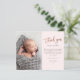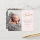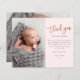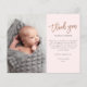 Esta foto moderna, graças a você, apresenta rosa gold, um obrigado de script manuscrito, mensagem pessoal e uma foto vertical na frente. O verso inclui uma segunda foto de bebê que é uma foto horizontal de cheio.