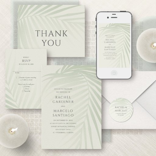 Um elegante design de verão para sua praia ou casamento de destino! As frondas serenas de palmeiras e a tipografia subestimada dão a esta design a sensação elegante perfeita para o seu casamento costeiro ou de destino. Solicite seus convites impressos e suprimentos de festas ou faça o download de seus convites digitais agora por um dia que eles nunca esquecerão!