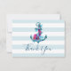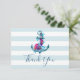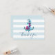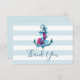 Design de cartões de agradecimentos de casamento náutico com âncora com flores em fundo azul de listras.