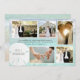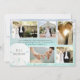 Cartões de agradecimentos de fotos de casamento com areia. Cartão plano com água do mar e fundo azul e cinco modelos fotográficos. Compartilhe fotos do dia do casamento, lua de mel, ou o que quiser. Um modelo de texto é fornecido no centro com espaço para uma mensagem curta de obrigados. Inclua as iniciais dos casais e a data do casamento no dólar de areia branca. O reverso também tem uma cena de praia.