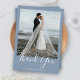 Obrigado de casamento, sua placa lisa apresenta uma fonte elegante com um design tipográfico moderno e limpo com fundo azul empoeirado. Este cartão está pronto para você personalizar com sua própria foto e detalhes.