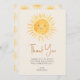 Este cartões de agradecimentos de chá de fraldas com tema solar apresenta um sorriso amarelo e uma tipografia de na moda num fundo creme. As costas estão decoradas com um padrão solar. Facilmente personalizável. Original Watercolor © Michele Davies.