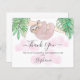 Cartões de agradecimentos de Chá de fraldas de Lama Rosa de Orçamento. Obrigado aqueles que frequentaram o chá de fraldas de sua filhinha com este lindo Cartões de agradecimentos de Bebê do Orçamento. É decorada com uma aquarela de uma doce preguiça bebê pendurada num galho, emoldurada com folhas verdes da selva e nuvens cor-de-rosa. Personalize este cartão com seu nome e mensagem. Porque nós criamos nosso próprio trabalho de arte você não encontrará essa imagem exata de outros designers. Original Watercolor © Michele Davies.
