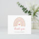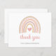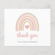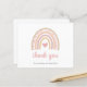 Garota Fofa Chá de fraldas com um arco-íris em cores pastel mutadas junto com um coração cor-de-rosa no meio. Abaixo está "obrigado você" no roteiro junto com os nomes de "Mãe a Ser" e "Bebê". O verso tem sua mensagem personalizada. Este cartões de agradecimentos personalizado torna fácil e rápido enviar suas cartas de agradecimento.