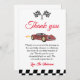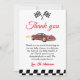 Cartões de agradecimentos para a celebração de aniversário de uma criança com uma corrida de carros. "Obrigado por nevar muito pelo fazer do meu aniversário tão maravilhoso."