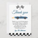 Cartões de agradecimentos para a celebração de aniversário de uma criança com uma corrida de carros. "Obrigado por nevar muito pelo fazer do meu aniversário tão maravilhoso."
