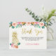 Procurando um abacaxi e cartões de agradecimentos floral? Este design apresenta um abacaxi dourado falso e texto em um fundo de papel d'água digitalizado. Eu também adicionei um arranjo floral pintado manualmente no topo e perto do abacaxi. O verso do convite é o padrão floral e do abacaxi. Esta design elegante, mas moderna, é uma maneira adorável de obrigado dos seus chás de fraldas convidados. Este chá de fraldas de abacaxi e arranjo floral está pronto para ser personalizado. O mesmo convite para chá de fraldas de design está disponível na loja.