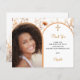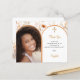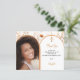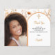 Um Cartões de agradecimentos de confirmação para uma garota. Adicione sua própria foto de tamanho vertical. Um quadro fotográfico em forma de arco dourado rosa. Decorado com ouro rosa, pêssego, flores silvestres beges e uma cruz ouro. Personalize e adicione um nome e a nota de agradecimento. 1 folha = 1 Cartões de agradecimentos impresso borda a borda.