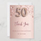 Um cartões de agradecimentos para 50º aniversário. Uma cor de fundo rosa dourada. Com rosa dourado pingando estrelas brilhantes. Na frente: número 50 escrito com uma fonte no estilo do balão, um grande script com letra rosa dourada escura e o texto: Obrigado, seu texto, título e uma data. Voltar: Personalize e adicione seu nome e nota de agradecimento.