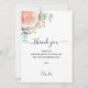 Um fundo branco, decorado com rosa dourado, rosa de cor aquosa, flor e verde de eucalipto. Escrita escrita com letras grandes com baloiços e o texto: Obrigado. Personalize e adicione sua nota de agradecimento e seu nome.
