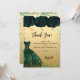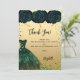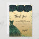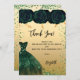 Um cartões de agradecimentos de aniversário feminino e elegante. Um fundo de aparência falsa de ouro, com brilho verde, faíscas, rosas verdes e um vestido verde. À frente, um grande texto escrito à mão e o texto: Obrigado.