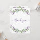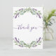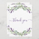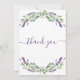 Um cartões de agradecimentos de aniversário feminino e elegante. Um fundo branco, decorado com lavanda, flores violetas e verde de eucalipto. Na frente, o texto escrito em letras grandes e o texto: Obrigado. Voltar: Personalize e adicione seu nome e nota de agradecimento. O nome é escrito com um moderno estilo escrito à mão.