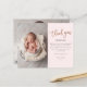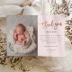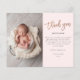 Esta foto moderna, graças a você, apresenta rosa gold, um obrigado de script manuscrito, mensagem pessoal e uma foto vertical na frente. O verso inclui uma segunda foto de bebê que é uma foto horizontal de cheio.