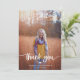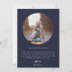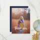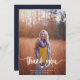 Sobreposição de fotos da tipografia branca-chic, cartões de agradecimentos de graduação. Recursos, foto de sangria de cheio na parte frontal, sotaque de boné de formatura, quadro de foto redondo na parte traseira com cor azul de marinho.