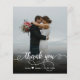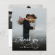 Cartões de agradecimentos De Foto De Casamento Elegante. Obrigado de casamento do Na moda moderno seu modelo de cartão postal com uma foto vertical do cheio na frente com a sobreposição de texto "Obrigado" em uma fonte de script de tipografia com letras esbranquiçadas com balsas em branco na foto. Placa de dois lados com 2 fotos. Personalize o seu nome personalizado e a sua mensagem de obrigado. Entre os nomes há um pequeno coração branco. Se preferir escrever manualmente a sua nota, basta eliminar o texto de amostra para obter mais espaço. Se precisar de ajuda ou item correspondente, entre em contato com o designer!