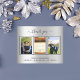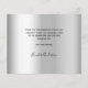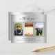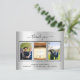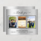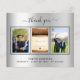 Adicione 3 das suas fotos, tamanho vertical, uma data, nome e a nota de agradecimento. Um fundo com aparência de prata falsa com texto e quadro preto. O texto: Obrigado na parte frontal e seu nome no verso é escrito com um roteiro à mão com na moda com baloiços.
