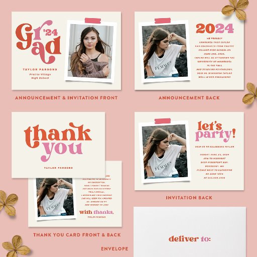 Envie sua graduação Obrigado em estilo com este Cartões de agradecimentos ousado, divertido e retrógrado de Graduação de Fotos. Esta placa apresenta a tipografia de vintage retrorativa e uma paleta cor rosa e laranja. Um tratamento fotográfico polaroide no verso adiciona à nostalgia e ao boho dessa design. O verso apresenta uma foto e muito espaço para o seu obrigado personalizado que você escreve. Um design divertido, ousado e colorido para enviar seu apreço aos que ajudaram a celebrar sua formatura.
