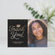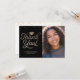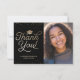 Este elegante e festivo Cartões de agradecimentos de Graduação de Fotos apresenta um confete dourado (folha simulada) com as palavras "Obrigado" mostrando em uma letra dourada. Há uma área de fotos personalizada para sua foto do formando. O fundo é preto, mas pode ser alterado para qualquer cor de sua escolha. A parte traseira da placa apresenta uma área de mensagem, bem como um espaço de vazio abaixo para que o formando assine o seu nome e uma possível nota extra escrita à mão. Uma maneira bela e simples de obrigado de convidados.