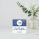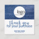 Modelo editável para a empresa fazer obrigado para suas placas de gabinete de compra em suas embalagens. Este modelo pode ser editado para adicionar o logotipo da sua própria empresa, assim como todo o texto personalizado que está sendo editado. As cores da placa são azul e branca, com um gráfico atrás do logotipo do denim azul. Há itens de embalagem como caixas, bolsas e papel de embalagem disponíveis para acompanhar esta linha.