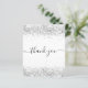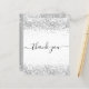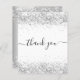 Na frente: um fundo branco chic. Com brilho de prata sujo, brilha. Na frente, o texto escrito em letras grandes e o texto: Obrigado. Fundo com aspecto de prata falsa e faíscas. Personalize e adicione seu nome e nota de agradecimento. O nome é escrito com um moderno estilo escrito à mão com traços. Para manter as hastes, exclua apenas o nome da amostra, deixe os espaços ou emoji na frente e depois do nome.
