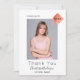 Um cartões de agradecimentos de fotos de formatura. Um clássico fundo branco. Na frente: Personalize e adicione uma foto de tamanho vertical, um nome, ano 20xx (ou qualquer ano) e nome da escola. Com o texto: Formando e Obrigado. Decorado com um boné moderno e abstrato em ouro rosa com dentro de ano. Voltar: adicione sua foto de segundo, sua nota de agradecimento e seu nome. O nome é escrito com um moderno estilo escrito à mão.