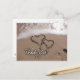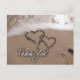 Obrigado em letra branca contra uma praia arenosa com dois corações desenhados na areia. Perfeito para o casal de casamento da praia pelas notas de agradecimento.