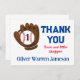 Cartões de agradecimentos de beisebol de um garoto divertido: primeiro aniversario. Luva marrom com um beisebol vermelho e branco (adicione o dentro da idade do seu filho à bola). Tipografia desportiva. Ideal para Chá de fraldas Menino, Primeiro Aniversário do Menino.
