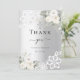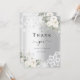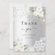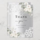 Um cartões de agradecimentos de batismo moderno e elegante e neutro em termos de gênero. Um fundo de olhar mal prateado. Decorado com rosas brancas, flores florais, rendas e uma pequena cruz. Voltar: Modelo para uma nota de agradecimento e nome.