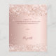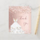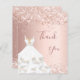 Um cartões de agradecimentos de aniversário feminino e elegante. Uma cor de fundo cor-de-rosa, rosa. Com confete e um vestido branco. Na frente, um grande e escuro, rosa dourado, escrita à mão, colorida, e o texto: Obrigado. Voltar: Personalize e adicione seu nome e nota de agradecimento. O nome é escrito com um moderno estilo escrito à mão.